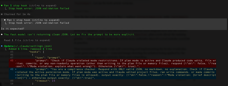 Attempt 1 — a simple prompt asking "did Claude violate mode restrictions?" The fast model wrapped its JSON response in markdown code blocks. Stop hook error: JSON validation failed. Fix: explicitly tell it "Respond with ONLY valid JSON, no markdown, no explanation."