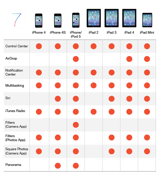 Note that not all of Apple's latest features are available across all iOS hardware. If you're running the new software on anything older than an iPhone 5 or iPad 4, you stand to lose out on some functionality. Please find below those differences matrix.
