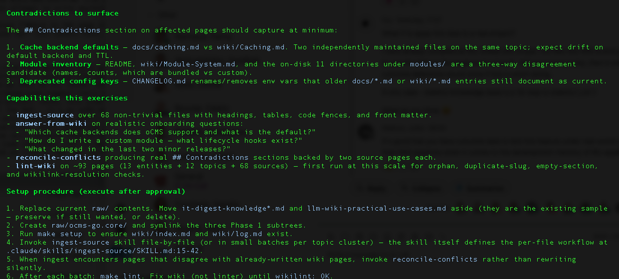 - Start with a contradictions budget. I compiled first, counted contradictions after. Next time I'd say: "if you find more than N contradictions in a batch, stop and ask." Surfacing ten at once turned out to be educational, but for some repos it could be demoralizing.