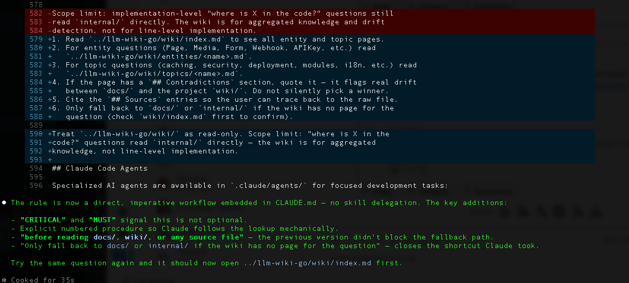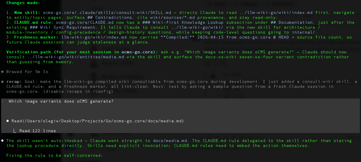 My first attempt was to add a skill called consult-wiki to ocms-go.core/.claude/skills/, write a CLAUDE.md rule that said "use the consult-wiki skill for architecture questions," and move on.