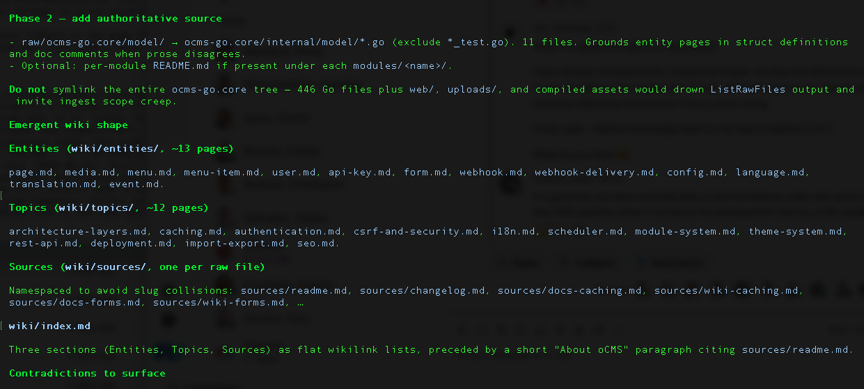 Every non-trivial claim on a page ends with a pointer to one or more source pages. Every source page ends with a pointer to raw/ocms-go.core/<path>. Provenance is a chain, not a dangling footnote.