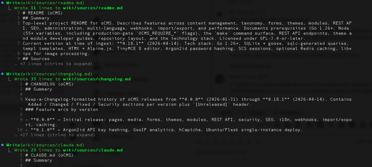 68 symlinks total. Ugly, but it means every wiki page has a stable provenance path back to a real file in oCMS, and edits in oCMS are reflected instantly without re-copying.